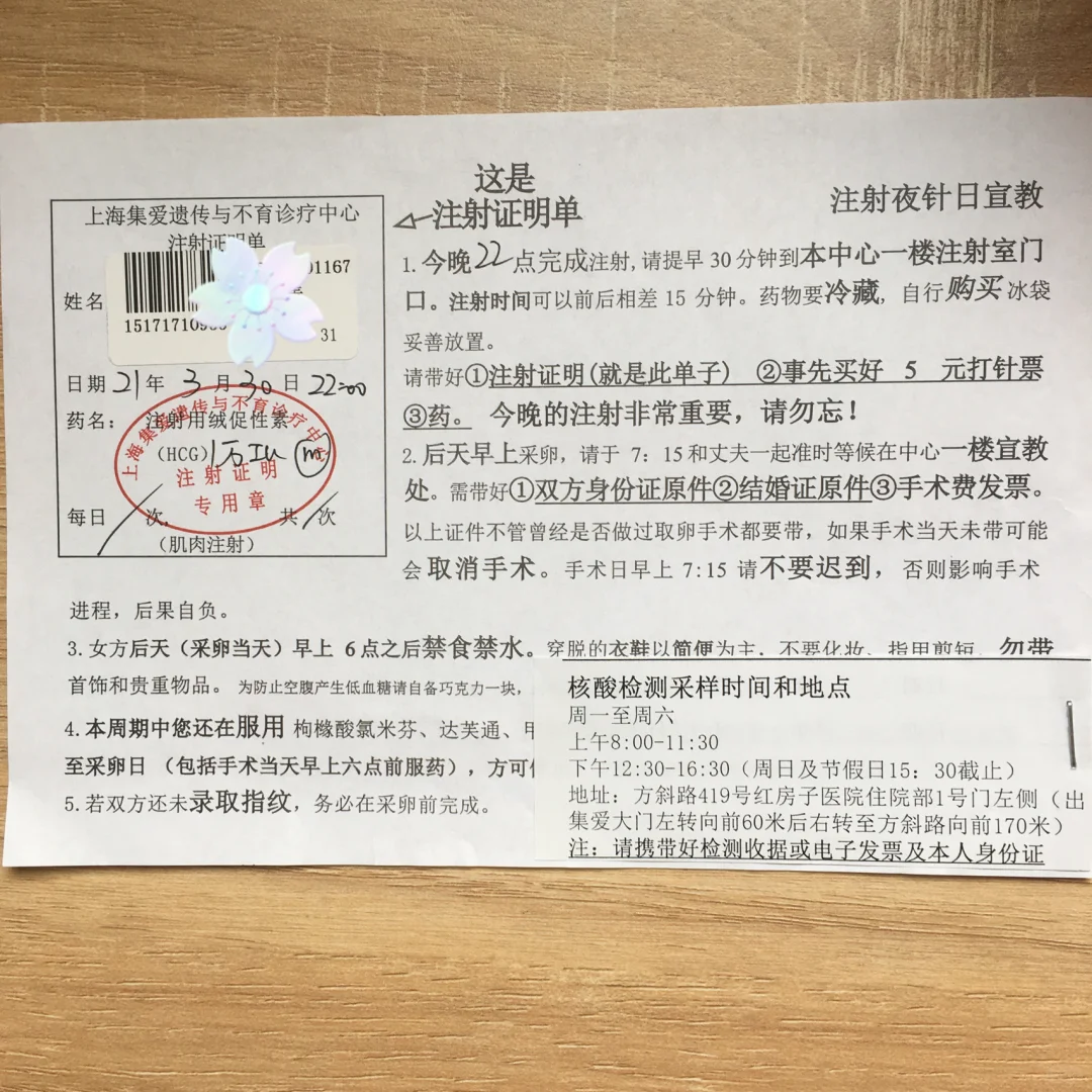 如果拿回当地医院打夜针的一定要提前去当地医院开好单子,晚上卡着时间点去打就好了,因为打针要在规定时间内完成的。我之前促排是在社区诊所打的,晚上社区诊所不上班,所以要去医院打针,那天是卡着点去医院的,没想到打个针而已要各种医生护士签字麻烦得很,差点都过了时间。