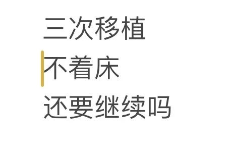 新问题。90年已经35岁了,生殖科跑了三年多了没有一点进展,平时还在工作,去医院都请假几个小时,取卵和移植都只休了一两天,基本没怎么耽误工作,但是两边跑也很焦虑。经济不好,收入也变低了,生殖的花费还每年在上涨,身心俱疲,而且已经没有信心了,每次还没移植就开始肚子疼,还没开始感觉就已经判定结束了。