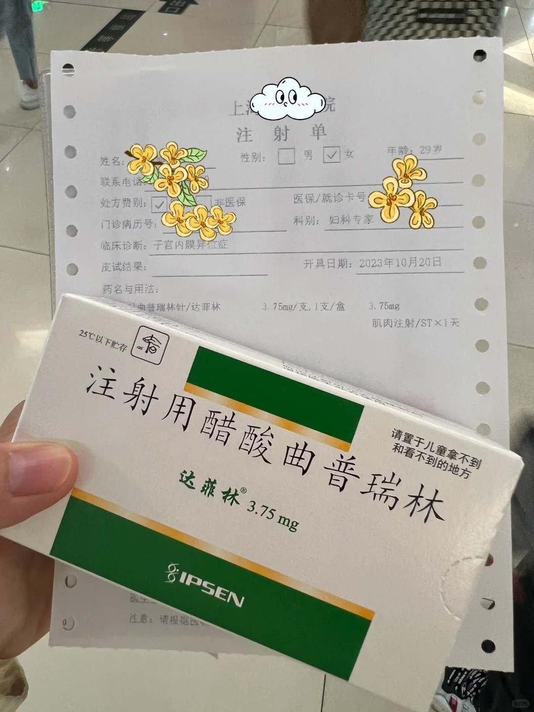 在此期间要绝经3个月,让子宫长好、输卵管恢复、内异症消退,所以术后第二天打了第一针达菲林,今天喜提第二针