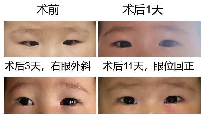 1.术后眼位存在不稳定情况,有些患者术后当天正位,之后短期内出现外斜视,反映了患者大脑整合调控能力的不足。发现此类情况不要慌,及时联系医生,给予适当干预,帮助孩子眼位回正。(图1)。