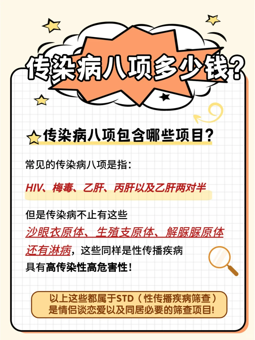 基础版:如果是做基础的传染病八项,梅毒、艾滋、乙肝丙肝筛查